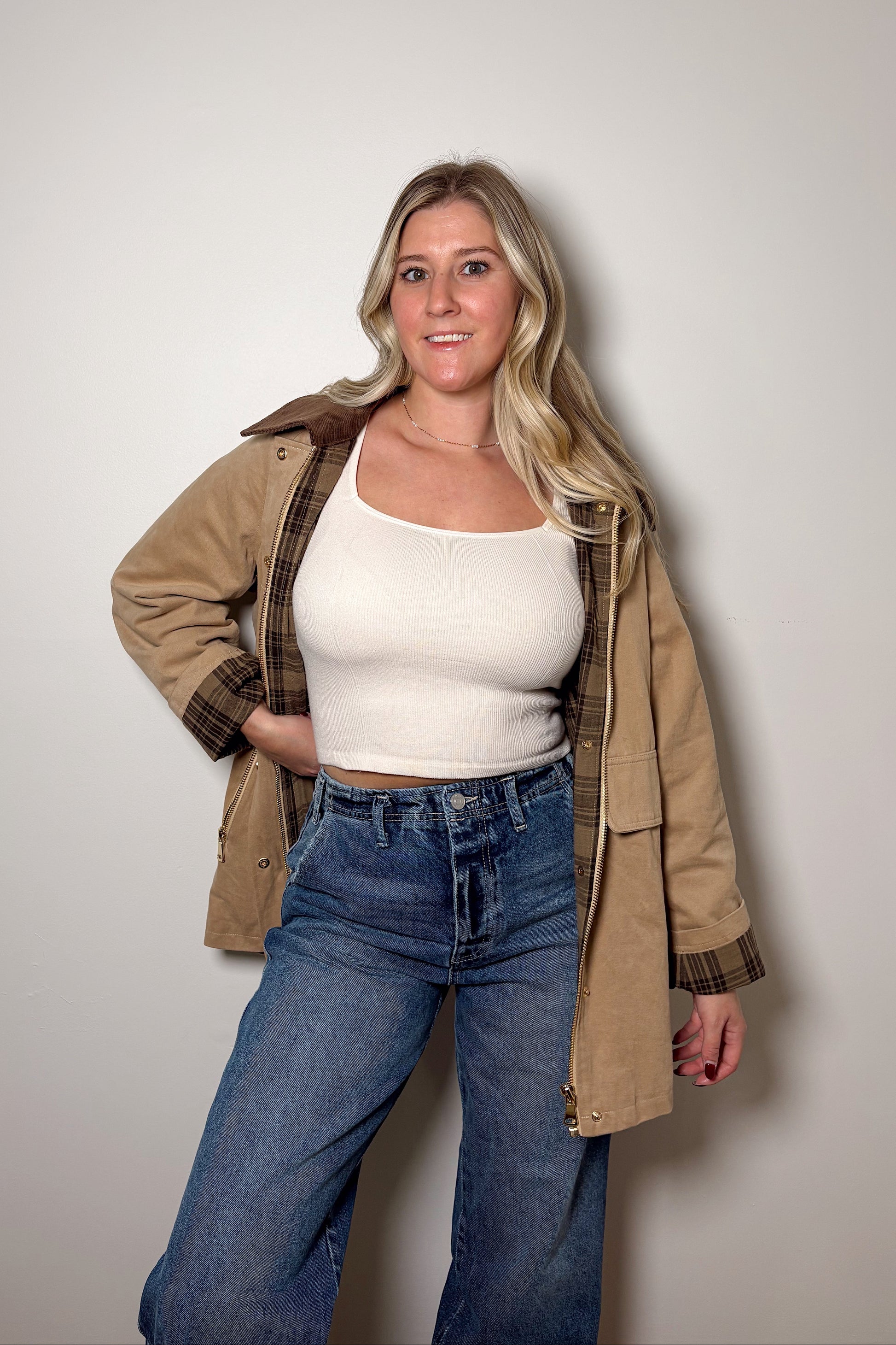 Crisp autumn days meet timeless heritage. This beige barn jacket, lined with plaid and finished with a contrasting corduroy collar, brings warmth, texture, and effortless layering to your fall wardrobe. Perfect for weekend walks, pumpkin patches, or sipping cider by the fire.