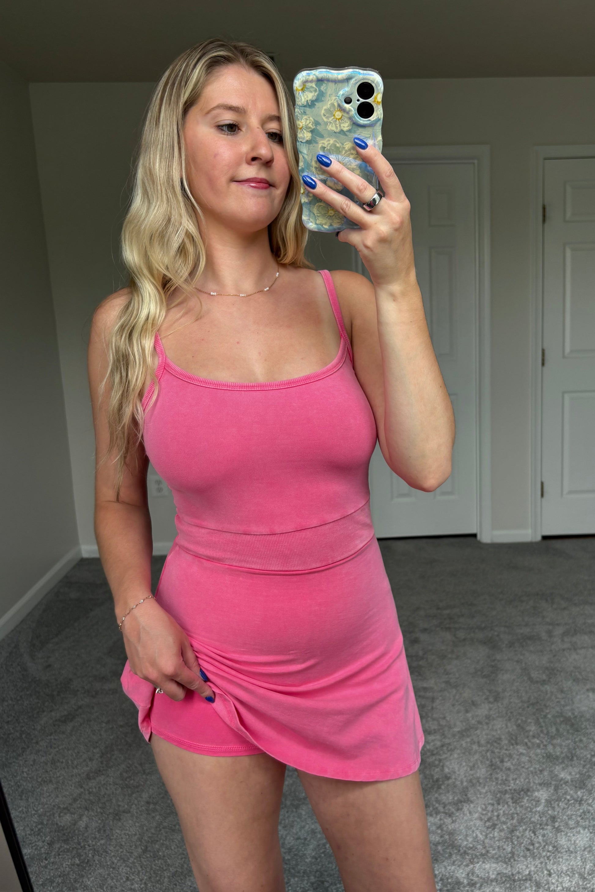 - Cami dress with built-in shorts, scoop neckline, mineral wash with ribbed contrast