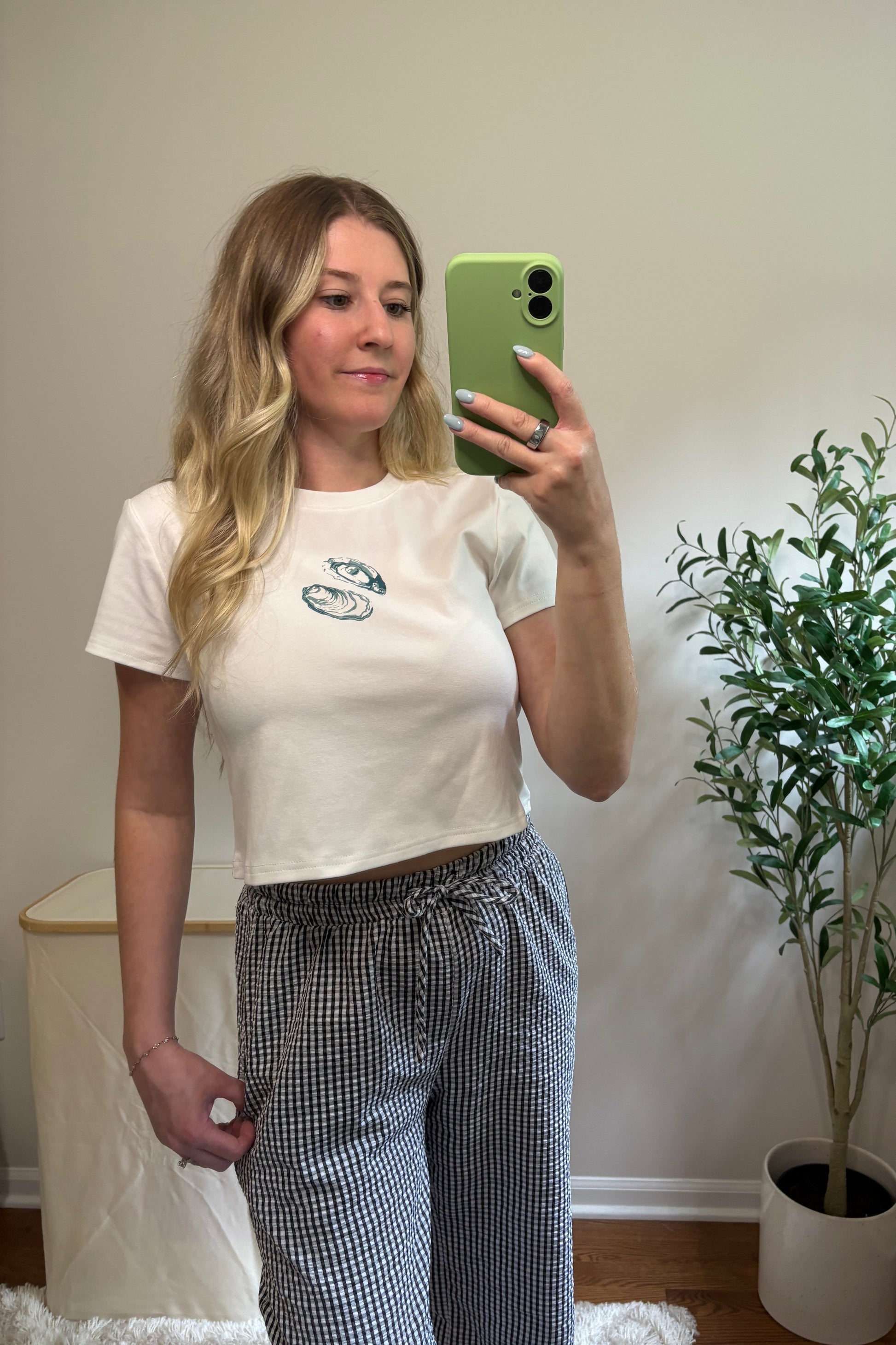 With a little touch of coastal charm, our Oyster Baby Tee is the perfect white tee for summer! Featuring a shrunken, classic baby tee fit in a soft, structured cotton. Effortless and whimsical, this tee is a must-have for your summer wardrobe.