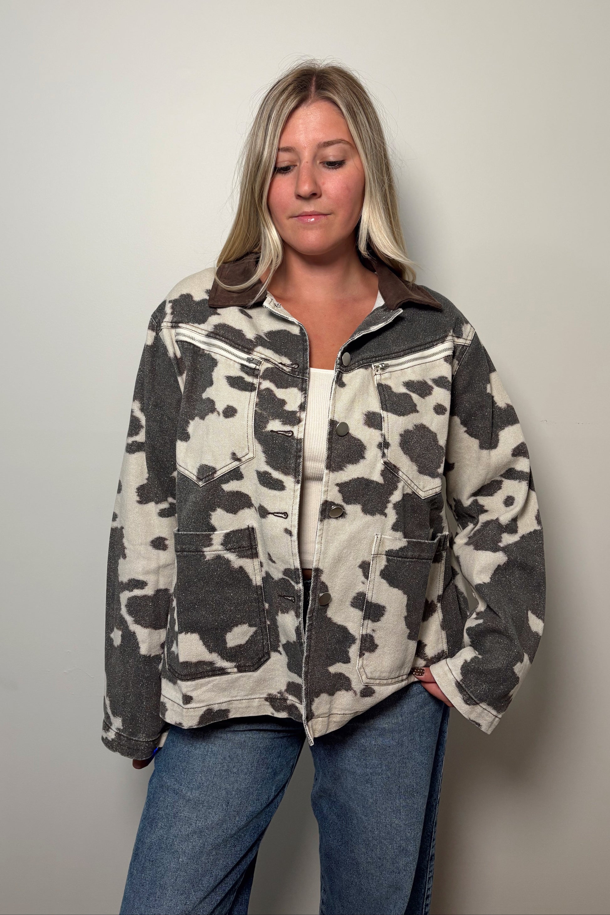 Channel effortless western charm in this statement barn jacket. Featuring a bold cow-print design, a cozy button-up fit, and that rustic barn-inspired vibe, this jacket is equal parts playful and chic.